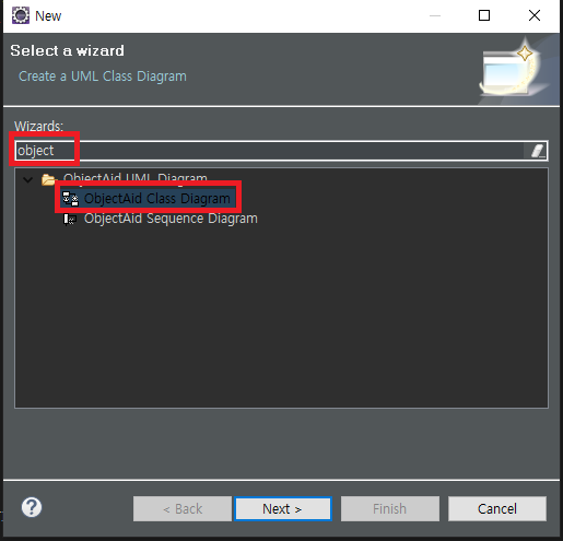 object 라고 검색하면 방금 설치한 ObjectAid 에 ObjectAid Class Diagram 이 보입니다. 선택한 후 Next 를 클릭합니다.