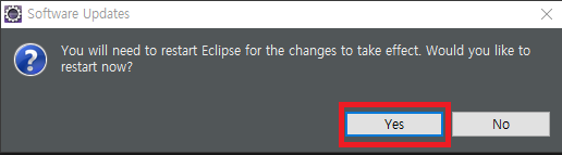 재부팅여부를 묻는 창입니다. Yes 버튼을 누르고 이클립스를 재부팅해줍니다.