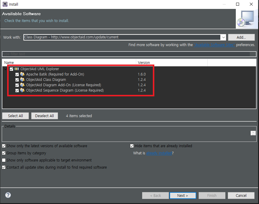 설치할 수 있는 것들이 뜨는데요. 저는 여기서 Class Diagram 과 sequence Diagram 2개만 설치할 예정입니다.
