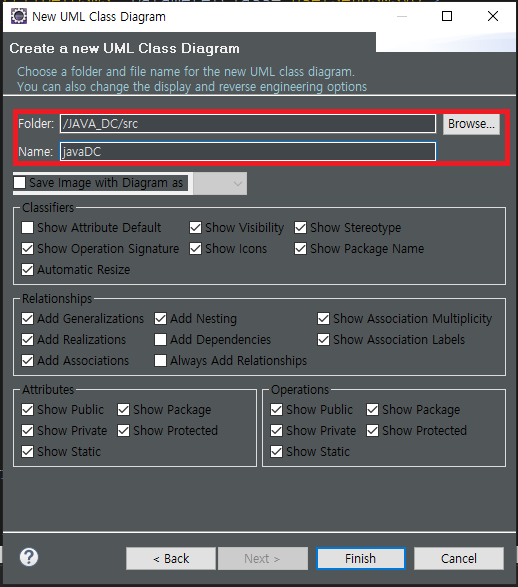 Folder 는 Browse 를 클릭하여 클래스다이어그램을 그리고자하는 프로젝트를 클릭합니다. Name 은 원하는대로 쓰시면 됩니다.