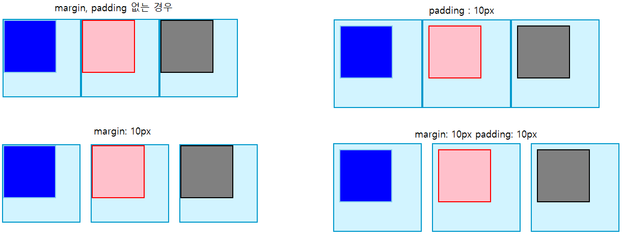 위 예제처럼 box(요소)간에 간격을 주고 싶을 경우에는 margin을 사용하면 된다. 각자의 필요한 상황에 맞추어 활용하면된다.