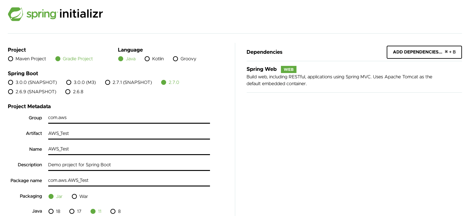 스프링 부트 프로젝트를 생성할 수 있는 사이트에 접속하여 Project Metatdata 를 입력한다.