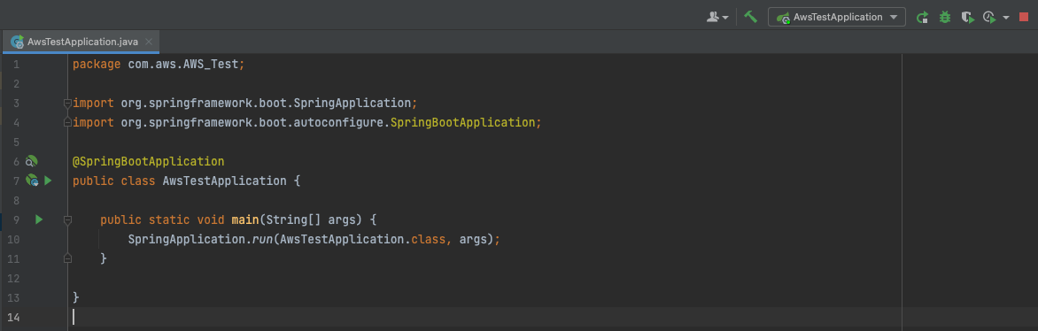 프로젝트가 생성되면 ~~Applicaion 이라는 파일이 생성된다. 해당 파일을 들어가보면 @SpringBootApllicaion 이 있다. 클래스명 좌측에 있는 Run 버튼 또는 우측 상단에 있는 버튼을 클릭하여 빌드 및 실행하면 된다.