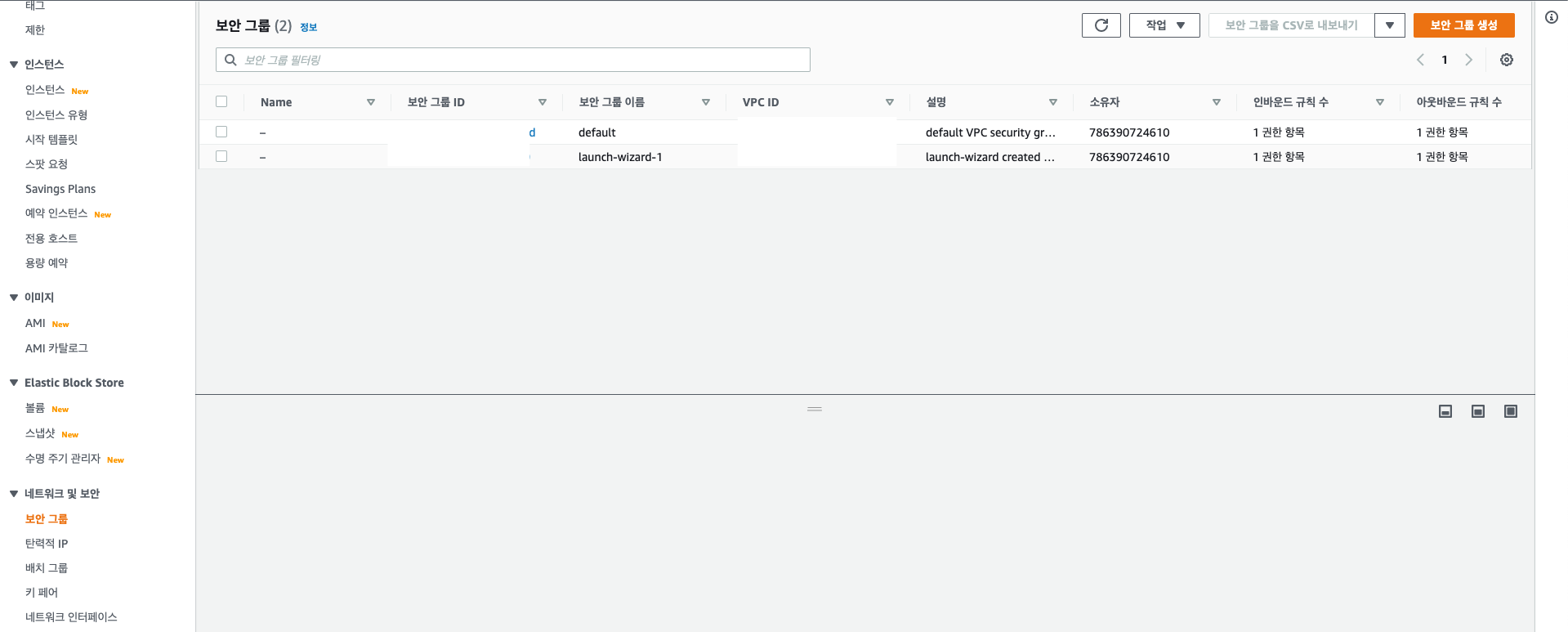 좌측 네트워크 보안 - 보안그룹을 클릭한 후, 해당 보안 그룹을 선택하고 하단의 인바운드 규칙 탭에서 [인바운드 규칙 편집] 버튼을 클릭한다.