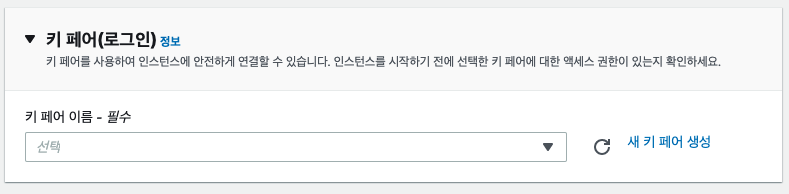 키 페어가 없는 경우 우측의 [새 키 페어 생성] 버튼을 클릭하여 생성하면 된다.