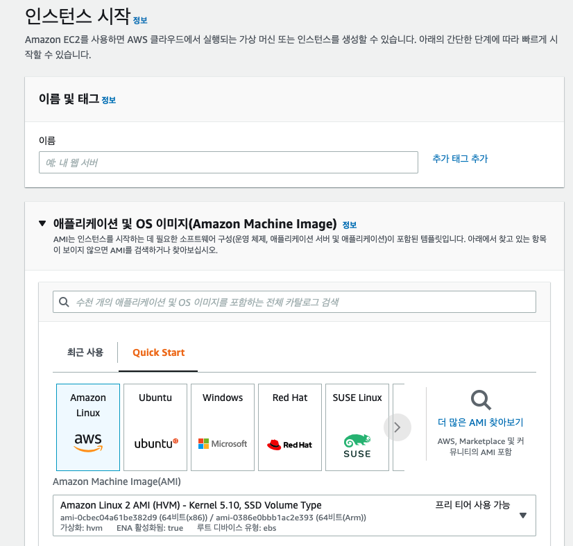 이름 및 태그 부분에서 이름은 임의로 입력하면 된다. (나의 경우 EC2TEST 이런 식으로 입력했다.)