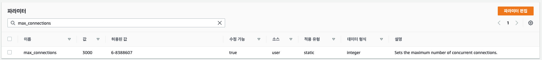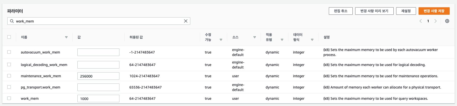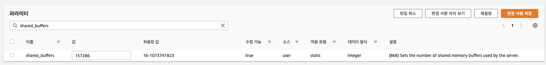 RDS -> 데이터베이스 -> 데이터베이스명 -> 구성을 보면 파라미터 그룹이 있다. 그걸 클릭하면 pg_setting에 있던 값들이 나온다. DB에서 update문을 사용하여 직접 수정하는 게 아니라 파라미터 그룹에서 수정하면 된다.