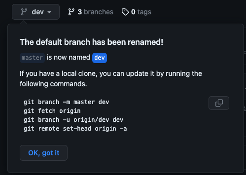 3. 해당 저장소의 정보가 dev로 변경된 것을 확인한다.