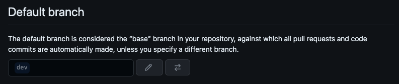 보통 PR(Pull Request)를 날릴 때 기본브랜치로 설정되는데 그때 개발 브랜치인 dev로 하고 dev에서 main으로 PR을 보내려고 하기 때문이다. 기본 브랜치를 dev로 설정해두면 따로 건드리지 않고 작업하기 편리하다.