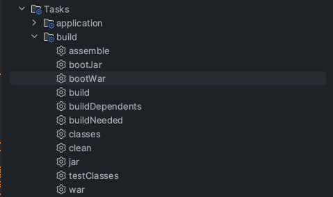 gradle 새로고침 버튼을 클릭하여 수정한 내용을 동기화한 뒤, Tasks-build의 bootWar를 클릭하여 war 파일을 생성한다.