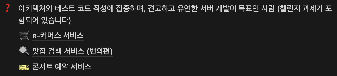 동시성 테스트부터 다양한 경험을 할 수 있었기 때문이라고 한다. 그래서 이번에는 e-커머스를 많이 선택할 수 있도록 기존 요구사항에서