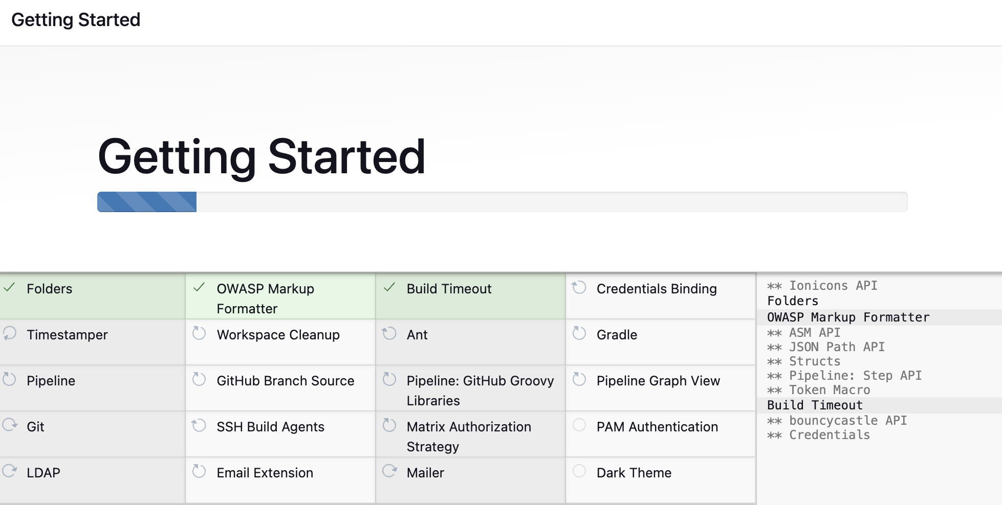 어떤 것을 선택할지 모른다면 왼쪽의 Install suggested plugins 를 선택하면 오른쪽 화면과 함께 설치가 진행된다.