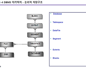 - segment : 저장공간을 가진 Object ex) table, index view - extent : 공간의 단위, 연속된 Block 의 집합 - block : I/O 의 최소 단위 오라클 Record 는 가변! * Block 은 아래서부터 데이터가 생긴다. - Row Directory : block 의 위치를 알려주는 Pointer => 모든 데이터 파일, 파일에 고유한 번호를 붙인다. => Row ID 구성요소 : 데이터 파일 번호, 데이터 파일 내 Block 의 번호, Block 내의 Record 번호 (Record와 Row는 동일한 개념) 마치 컬럼과 필드가 같은 개념인 것처럼... * SELECT 되는 구조 Server Process 는 SQL을 3단계에 거쳐 처리한다. => Parsin..